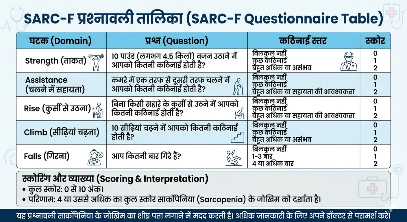 SARC-F प्रश्नावली: यह एक सरल प्रश्नावली है जो ताकत, चलने में कठिनाई, उठने-बैठने की क्षमता, सीढ़ियाँ चढ़ना और गिरने की घटनाएं आदि 5 प्रश्नों पर आधारित होती है। इसको दी गई तालिका से ठीक से समझा जा सकता है